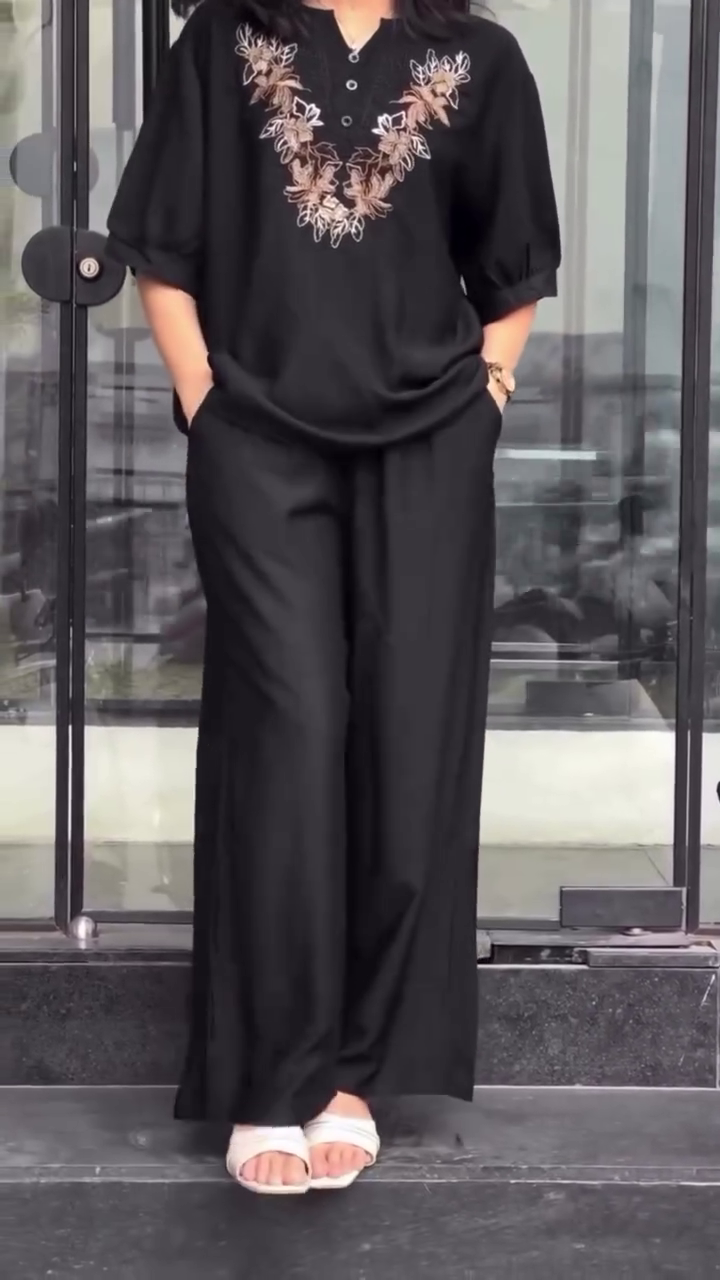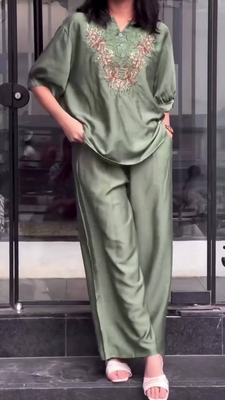 The matching bottoms complete the ensemble with a coordinated look that exudes style and confidence ๐. Depending on the style, the bottoms may be tailored pants, wide-leg trousers, or a comfortable skirt, all crafted to complement the embroidered top seamlessly. Together, the 2-piece set offers a ready-to-wear, hassle-free outfit that looks chic with minimal effort.