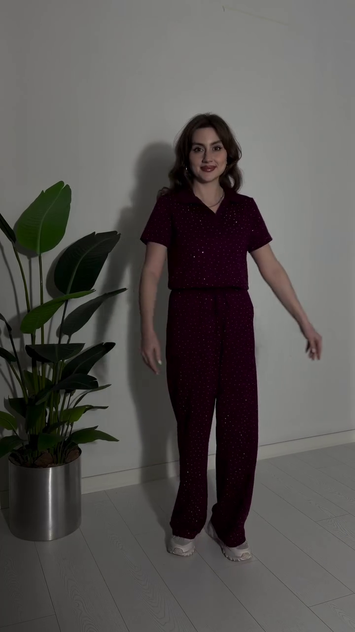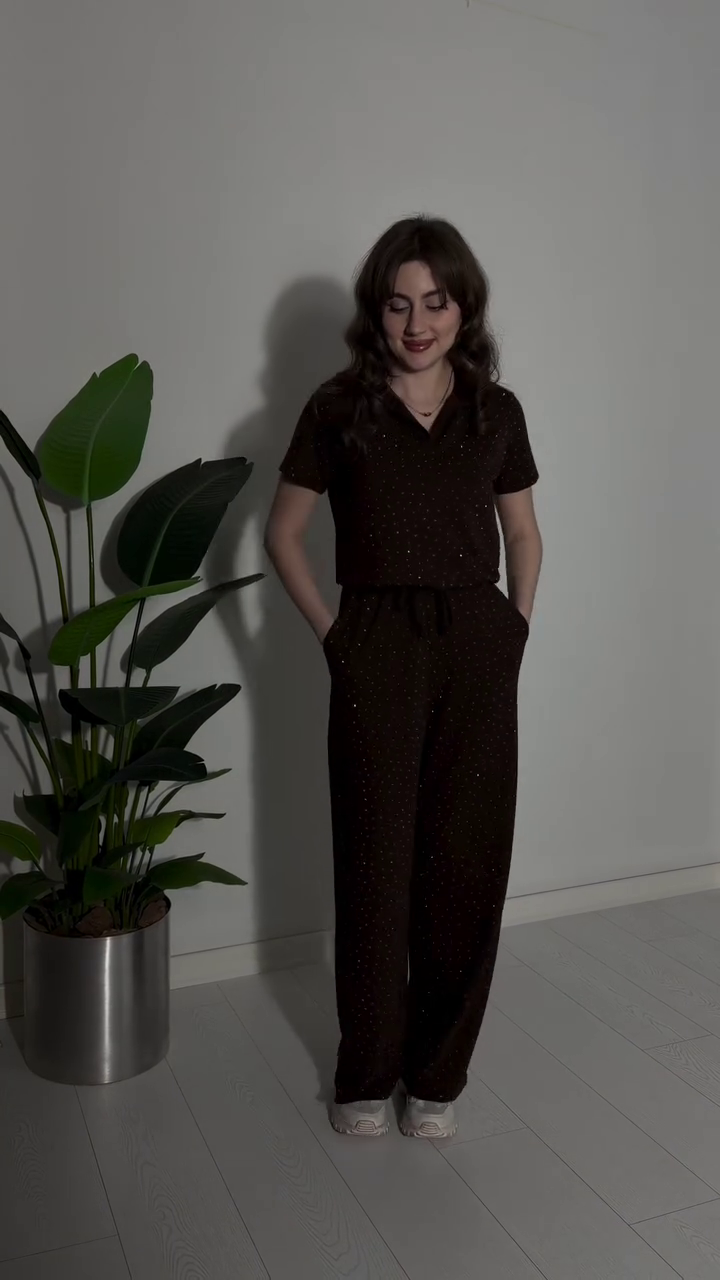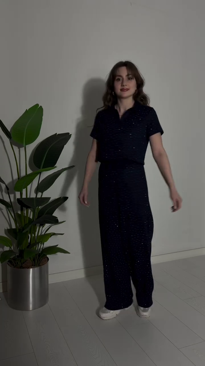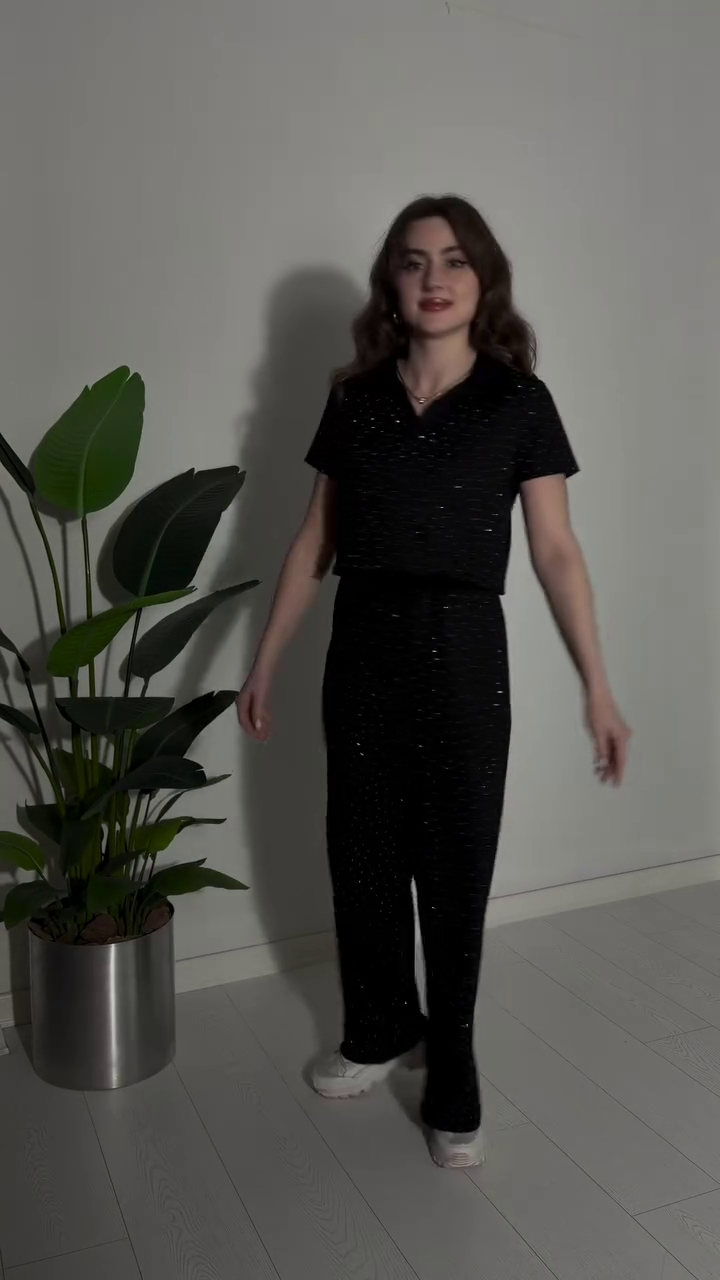Crafted in a sleek black base with delicate sparkle detailing 🖤, this two-piece set features a relaxed short-sleeve top paired with flattering straight-cut trousers. The soft shimmer woven throughout the fabric catches the light beautifully, adding just the right amount of glow without overpowering your look 💫.