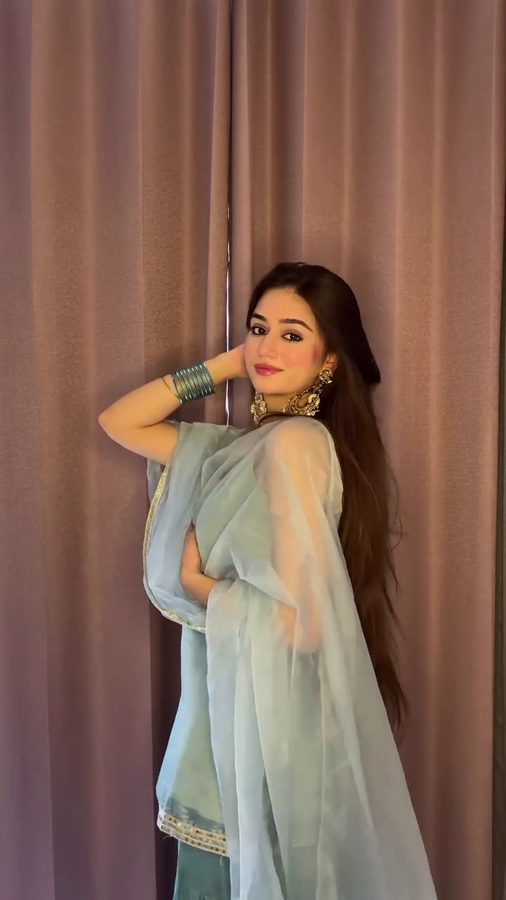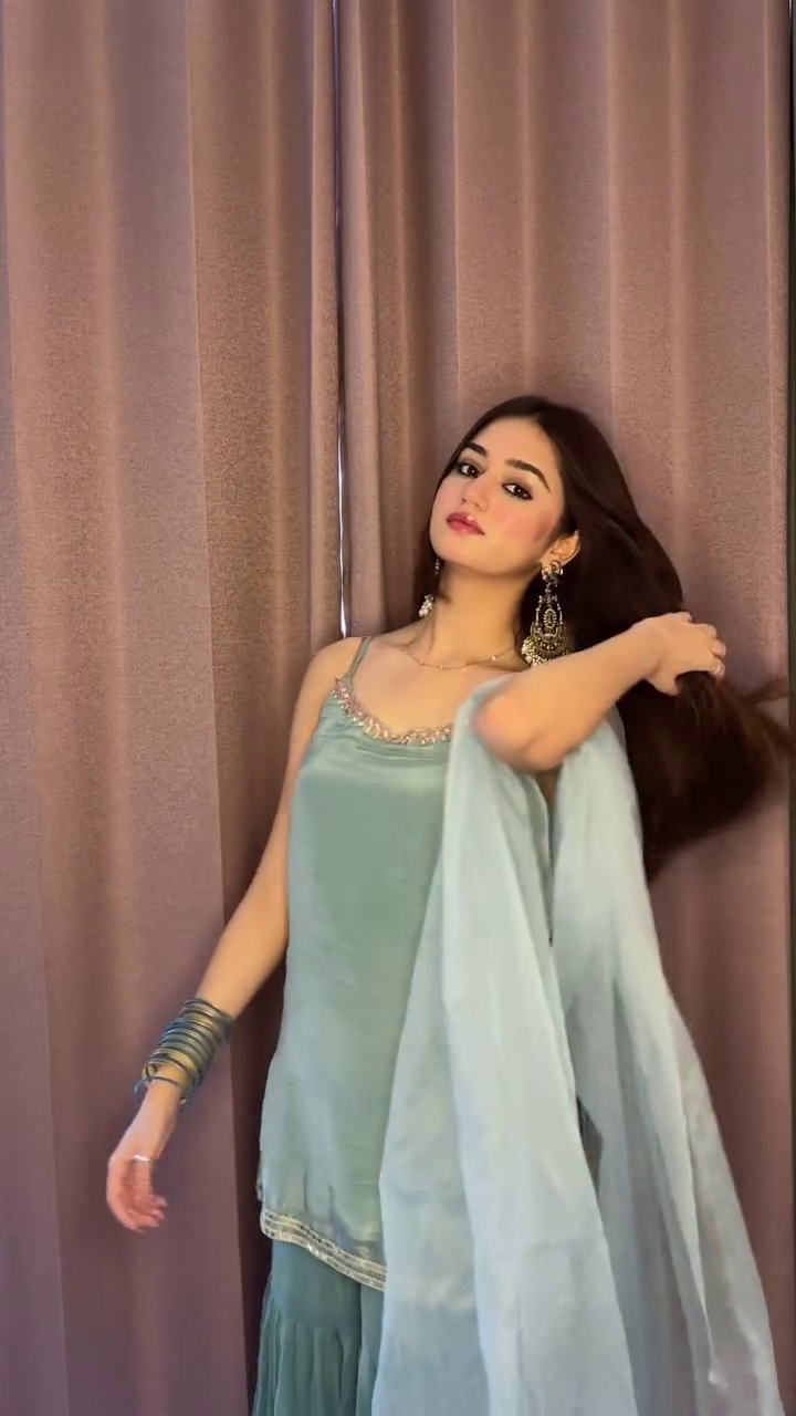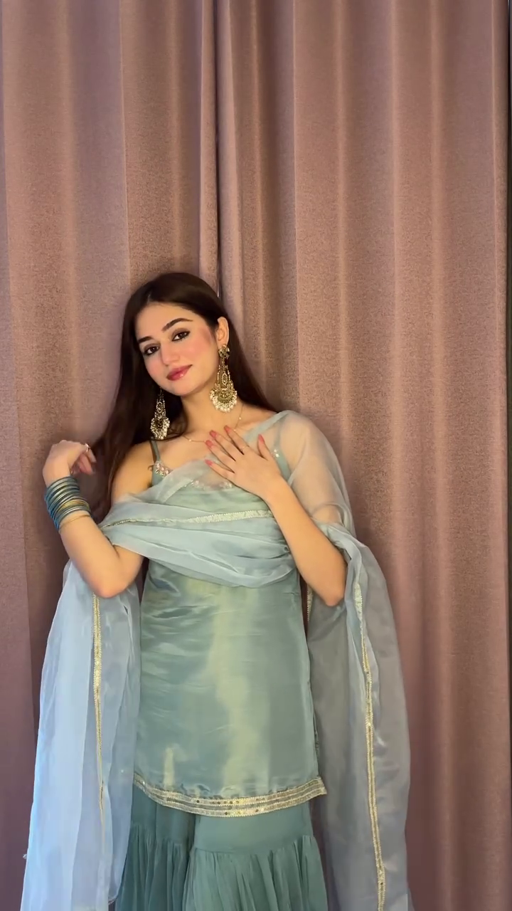 The kurta features intricate embroidery and delicate detailing, paired with a flowy sharara bottom that adds movement and grace to your look. The matching dupatta with subtle embellishments completes this beautiful ensemble, giving it a regal touch perfect for festive dinners, celebrations, and cultural occasions.