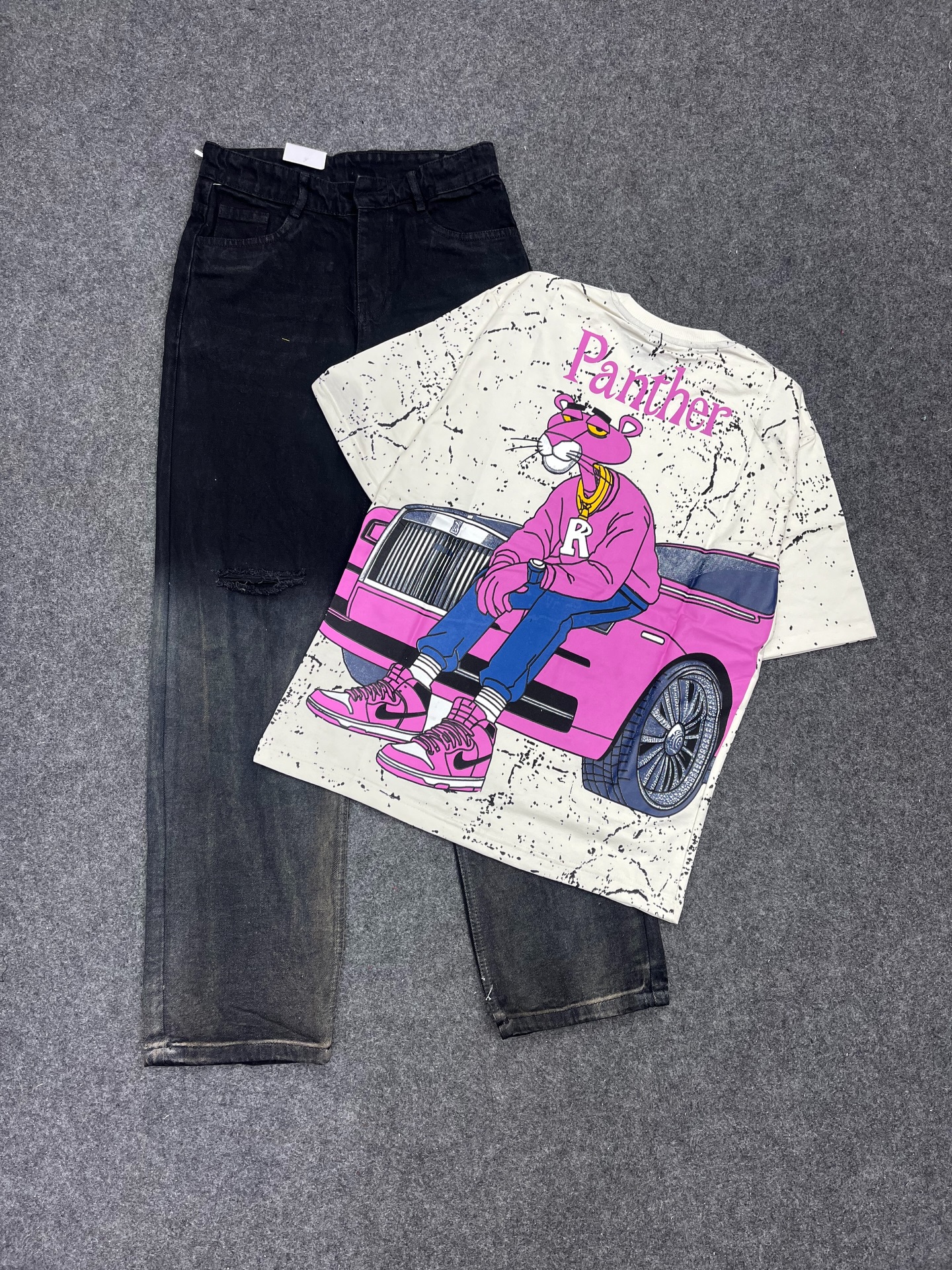 πŸ€πŸ–€ White Pink Panther Graphic T-Shirt & Black Faded Wide-Leg Jeans – Playful Street Style Meets Edgy Comfort πŸ–€πŸ€