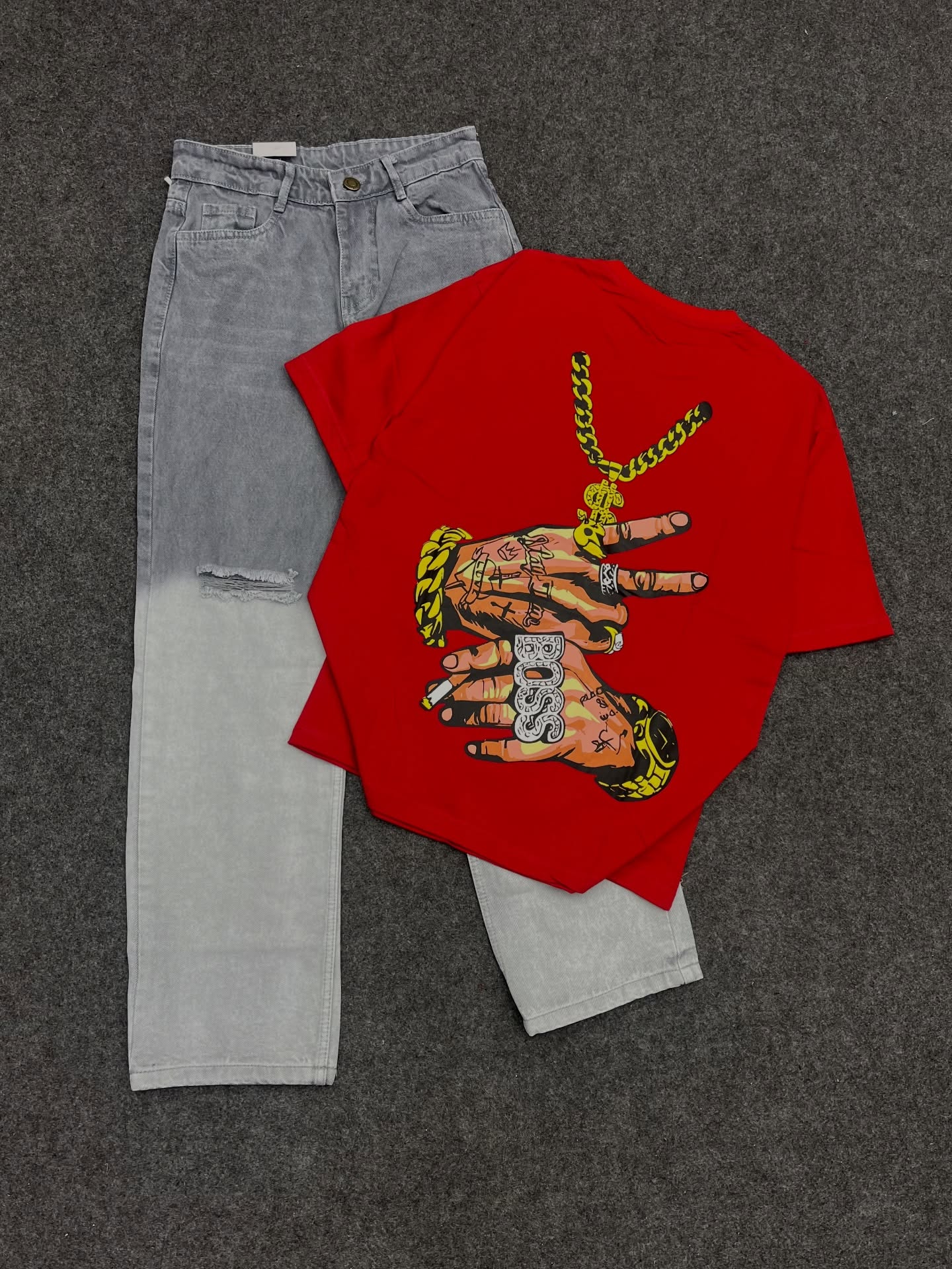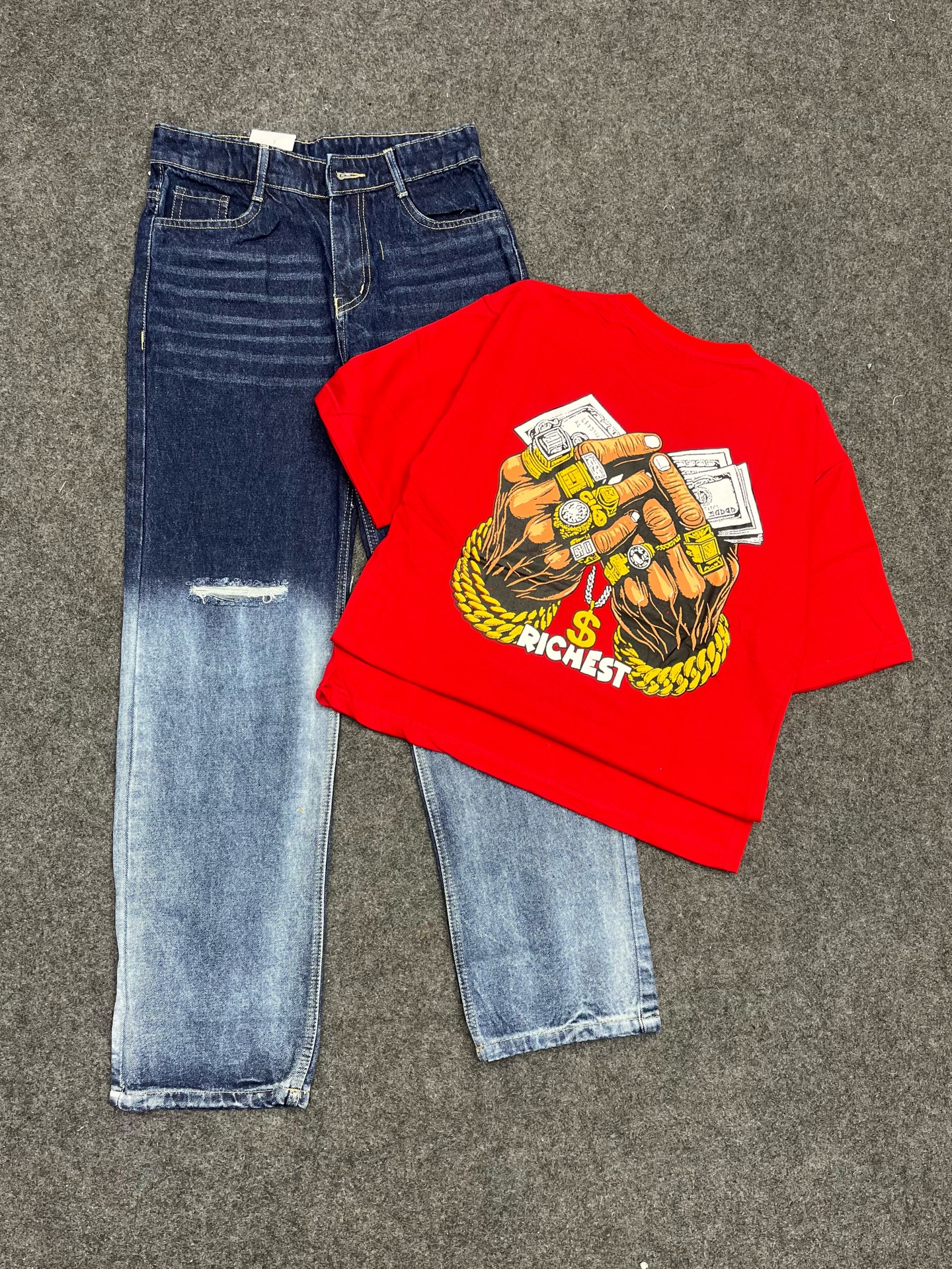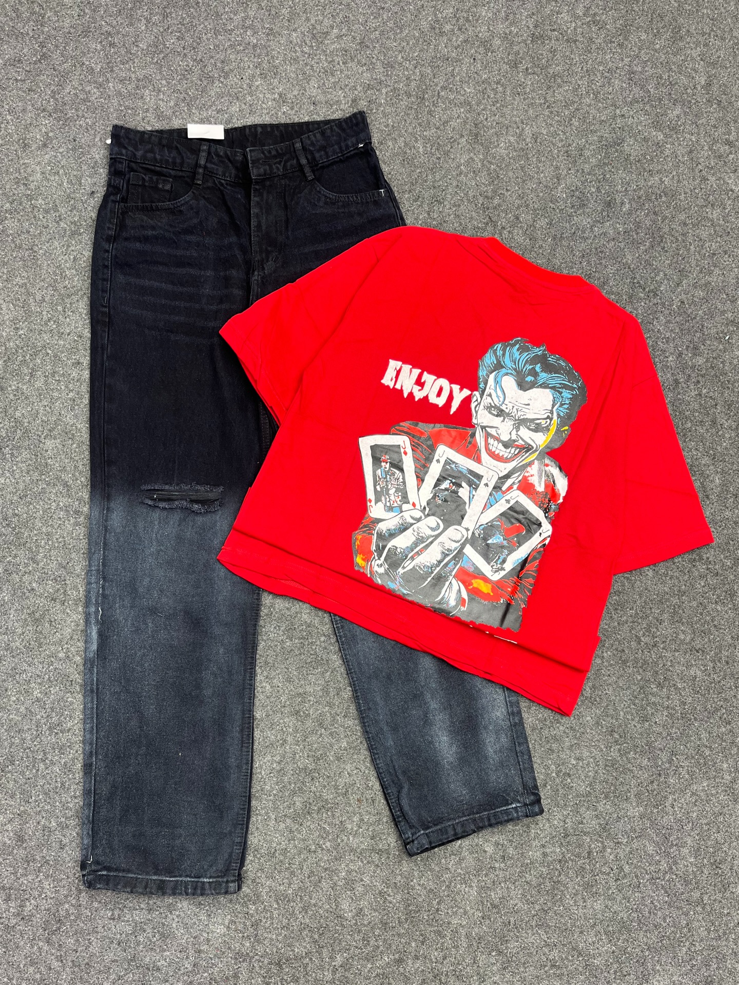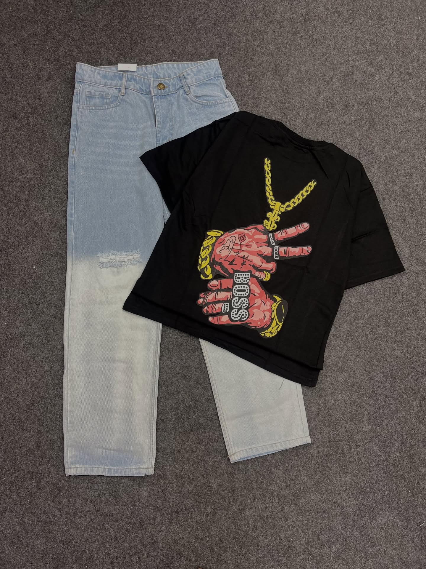 This combo is ideal for men who enjoy mixing fun, graphic elements with bold, relaxed denim styles. Pair the outfit with sneakers, boots, or casual slides, and accessorize with caps or chains for a complete streetwear-inspired ensemble. The combination of crisp white, vibrant graphics, and faded black denim ensures that your look is both playful and edgy, making it perfect for expressing individuality and style.