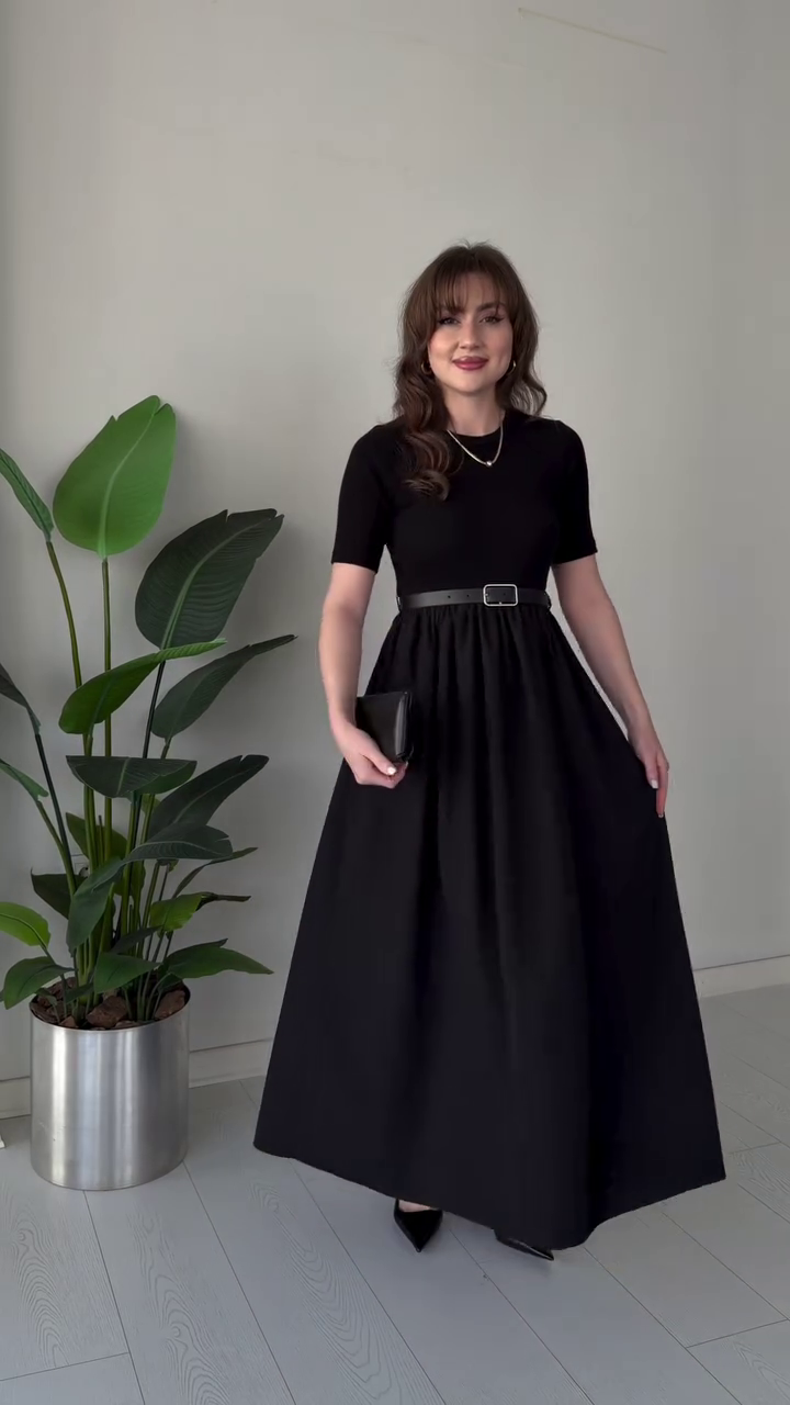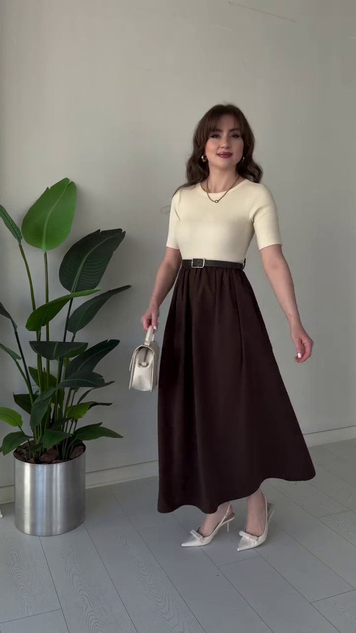 Crafted in a rich mocha brown tone 🤎, this maxi dress features a sleek fitted bodice with a classic round neckline and short sleeves, offering a refined and minimalist appeal. The soft, smooth fabric hugs gently at the top while flowing gracefully into a full-length skirt, creating a beautifully balanced silhouette that flatters every body type 💫.