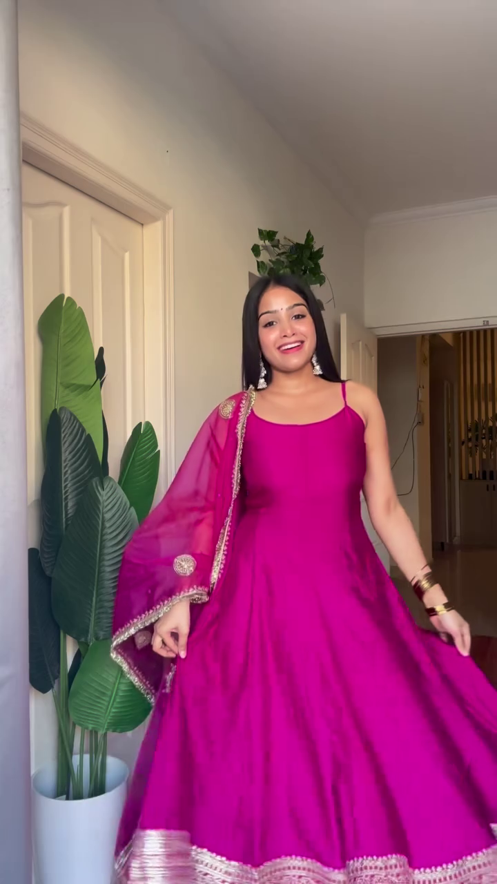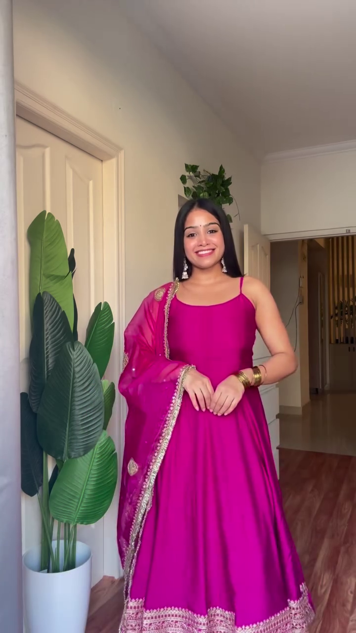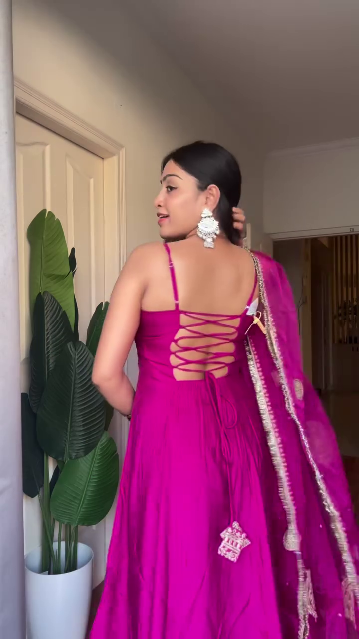 This vibrant pink Anarkali comes with a lace-up detail at the back, adding a modern twist to traditional elegance. The flowy silhouette and premium fabric ensure comfort while twirling, making it perfect for Diwali parties, weddings, or family gatherings.