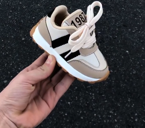 The first thing that stands out is the stylish neutral color combination of beige, black, and white. This versatile palette makes the sneakers easy to pair with a wide range of outfits—from casual jeans and joggers to shorts and everyday school wear. The “1987” text detail on the heel adds a trendy, street-style touch that gives the shoes a unique and fashionable identity kids will love.
