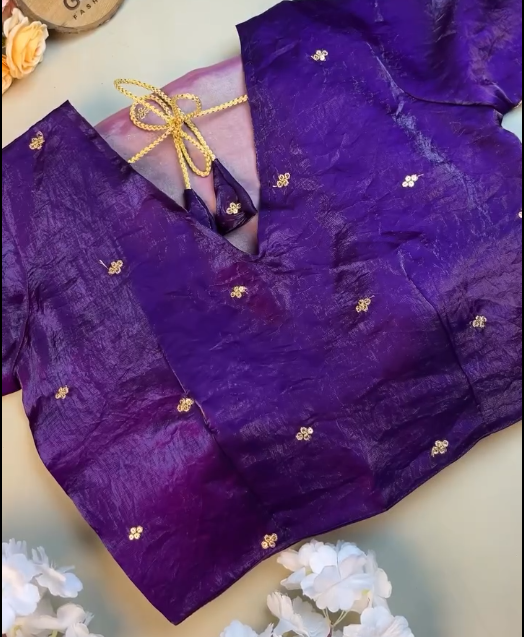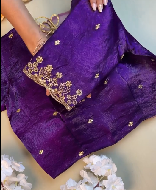 The saree features a stunning purple shaded tone, beautifully blended to create depth, richness, and a regal appeal. Purple, a symbol of royalty and elegance, enhances the luxurious sheen of the satin fabric, making the saree glow gracefully under lights. The smooth, fluid texture of Jimmy Choo or Fendy satin ensures an elegant drape that flows effortlessly, accentuating your silhouette with a refined finish.