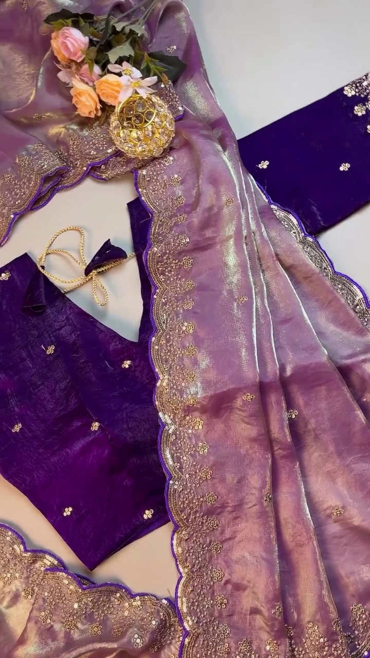 Indulge in refined luxury with this Purple Shaded Scalloped Border Saree, exquisitely crafted in premium Jimmy Choo or Fendy satin fabric. Designed for women who love sophisticated glamour and timeless ethnic fashion, this saree is a perfect choice for weddings, receptions, festive celebrations, and grand evening events.