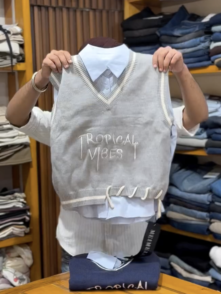 The ensemble centers on a V-neck sweater vest, a garment that has made a significant resurgence in modern fashion, blending vintage charm with contemporary flair. The vest in question is a light gray knit with the phrase “TROPICAL VIBES” embroidered across the chest in a clean, white script. This detail is the focal point, suggesting a relaxed, optimistic, and vacation-inspired mood that contrasts playfully with the classic, slightly preppy nature of the sweater vest itself.