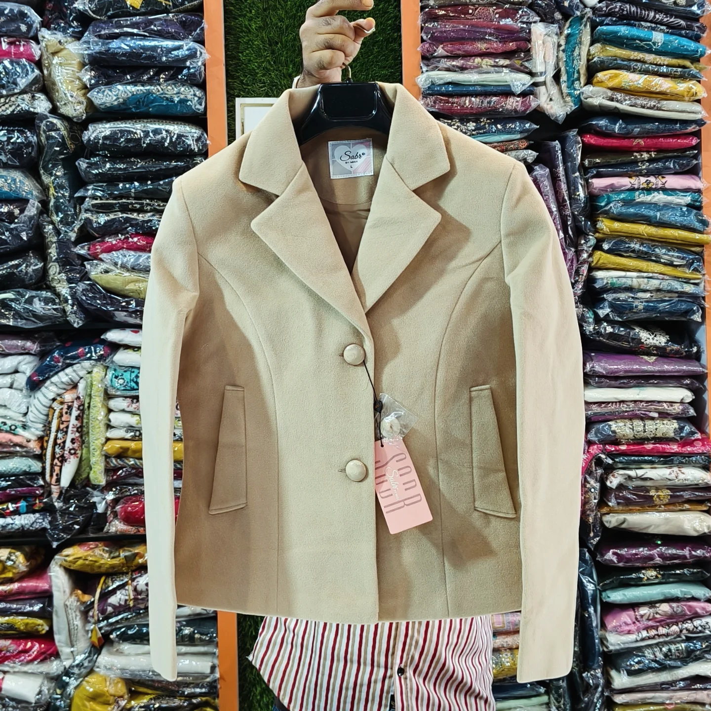 The two-button front closure enhances the classic blazer-inspired design, providing a clean and structured silhouette. Carefully tailored to flatter the waist and shoulders, the jacket delivers a slim yet comfortable fit that complements various body types. Whether worn open for a relaxed look or buttoned up for a polished finish, it ensures effortless sophistication.