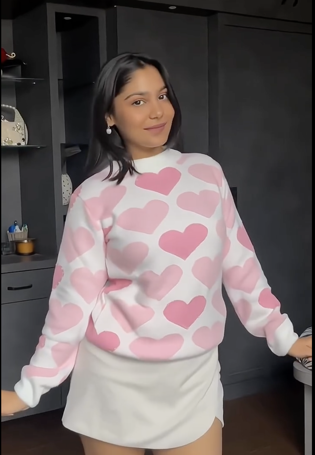 What truly sets this version apart is the stunning Valentine’s Day combo. Integrated seamlessly into the pattern are bold red and calming blue heart motifs, a beautiful representation of love’s passionate and serene sides. These hearts add a pop of vibrant color, creating a striking contrast against the pink and white background. The result is a harmonious and eye-catching design that speaks volumes. This versatile color palette makes it easy to pair with your favorite denim jeans for a casual look, or with a chic white skirt for a more elevated ensemble.